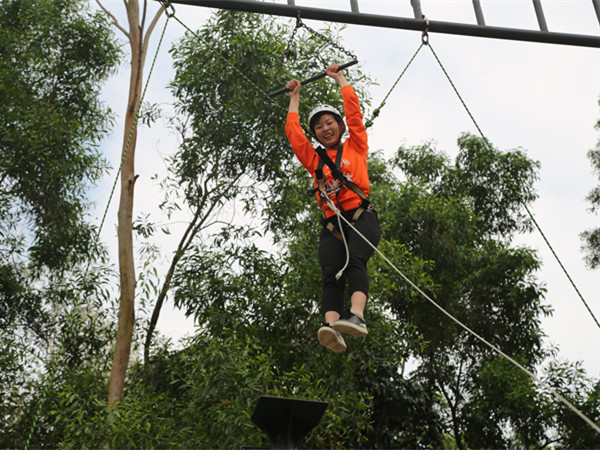 下午进行了“信任背摔”和“跳出真我”高空项目。“信任背摔”要求所有学员轮流站在一个1.6米的高台上,手被捆住,以后仰姿势落入下面的学员用胳膊搭建的坚强后盾。对站在“背摔”台的人而言,由于看不到背后的情况会产生“我摔下去会不会受伤”的焦虑,此时能否调整自己的心态,相信同伴的力量,果断、勇敢地向后倒下去,是取得成功的关键。虽然该项目看似平常,但它却验证了人与人之间心灵的交流和可信度,只有充分的相信自己,信任自己的伙伴,才能毫无顾忌的摔下去。这也启发了每一位学员在今后的工作中,要更加相信自己,信任每一位同事,并对公司发展的未来充满坚定的信念。
