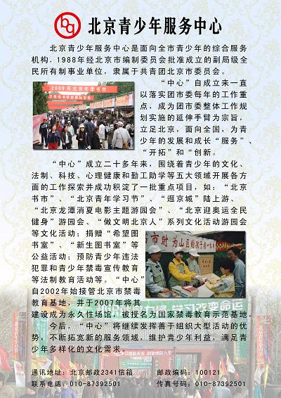 北京青少年服务中心(北京市禁毒教育基地管理中心)前身为北京青少年服务中心成立于1988年,2012年9月经市编办批准,加挂北京市禁毒教育基地管理中心牌子。中心内设办公室、青少年文化发展部、青少年法律维权部、禁毒教育培训部、禁毒社会活动部和综合信息部,六个相当副处级机构,主要承担为青少年提供服务、开展青少年问题研究和禁毒教育、基地管理职能两大职能。
