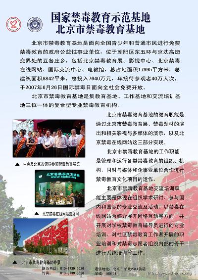 ——禁毒教育和基地管理职能。北京市禁毒教育基地于2007年6月26日国际禁毒日落成,是面对全国青少年和普通市民进行免费禁毒教育的政府公益性事业单位,是集教育、工作和交流培训三位一体,是立足北京、辐射全国、面向国际,汇集禁毒预防教育优良资源的专业服务机构。